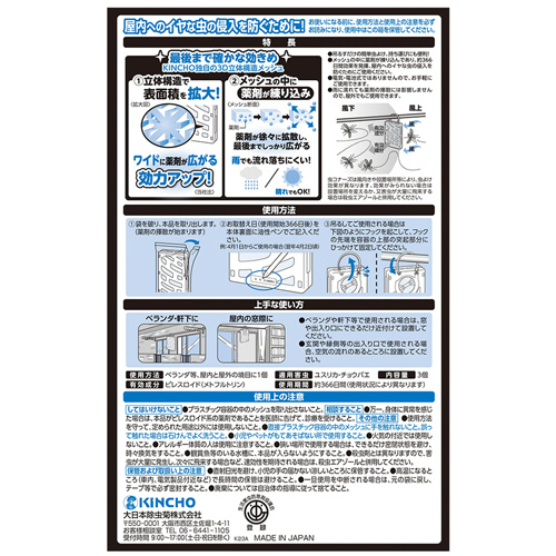 ●立体構造でメッシュの表面積が拡大し、僅かな空気の流れでも薬剤粒子が揮散し、薬剤がワイドに拡散します。無臭。