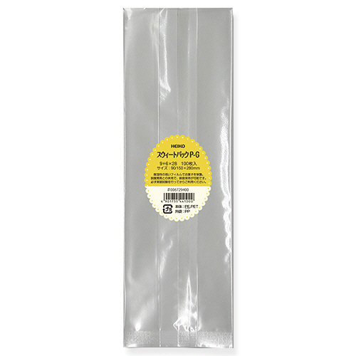 合掌貼りと呼ばれるガゼットタイプのポリ袋で、主に焼菓子などの包装に使用されます。