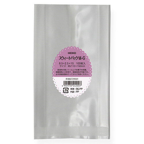 合掌貼りと呼ばれるガゼットタイプのポリ袋で、主に焼菓子などの包装に使用されます。