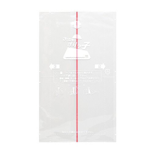 ●コンビニタイプと同じで、赤いテープを引くとフィルムが切れて簡単に取り出しができます。おにぎりの包み方・召し上がり方の説明書(ラベル)入りです。
