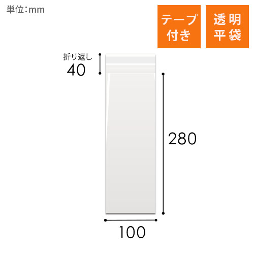 「OPP-S100-280T40」は、100mm×280mmの細長いサイズで、ペンやスリムな商品を収納するのに適したOPP袋です。