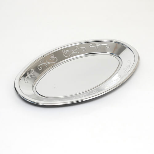 金属のお皿をイメージした小判型の皿です。オードブルを豪華に演出します。裏面は黒色で、製品の特性であるアルミ蒸着をより引き立たたせています。※電子レンジ使用不可※オーブン使用不可※耐熱温度:90度