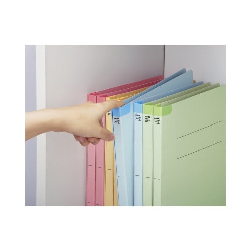 背見出しの上下をテープで補強した、背補強タイプのフラットファイル。約2倍(当社比)の耐久力を有しているので、繰り返しの使用にも傷みにくいです。簡単にとじ具の分別廃棄ができる樹脂製とじ具を採用。