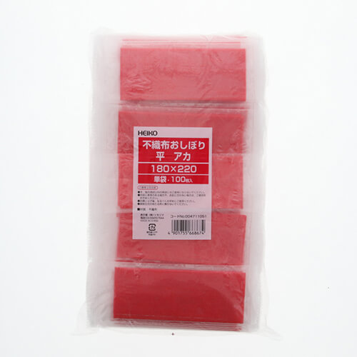 真っ赤な不織布タイプの平型おしぼりです。半透明の袋から見えるタイプです。整列梱包なので場所をとらず、コンパクトにすっきりきれいに陳列・収納できます。サイズは180×220mmです。