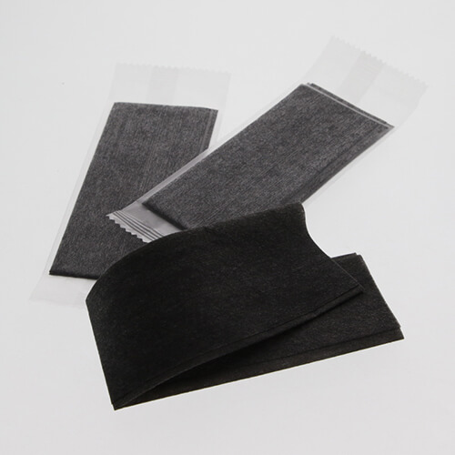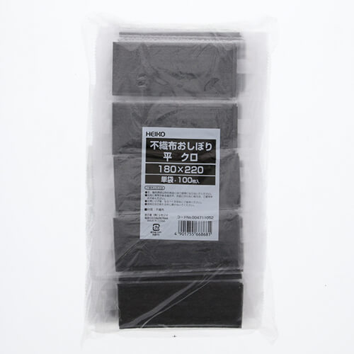 スタイリッシュな黒の不織布タイプの平型おしぼりです。半透明の袋から見えるタイプです。整列梱包なので場所をとらず、コンパクトにすっきりきれいに陳列・収納できます。サイズは180×220mmです。