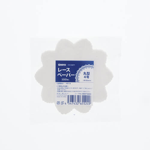 紙をレース模様に切り抜いたレースペーパーです。ケーキやお菓子、サンドイッチなどをのせたり、敷き紙として使うと手軽に高級感がアップできます。サイズは103×103mmです。