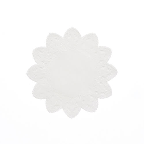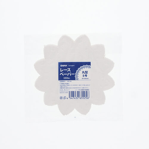 紙をレース模様に切り抜いたレースペーパーです。ケーキやお菓子、サンドイッチなどをのせたり、敷き紙として使うと手軽に高級感がアップできます。サイズは128×128mmです。