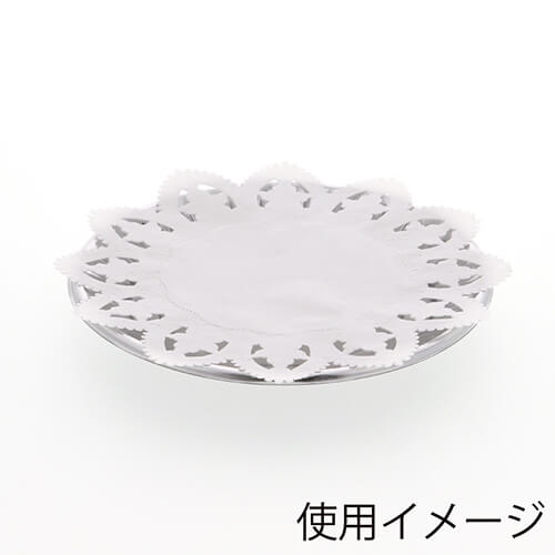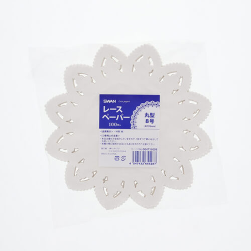 紙をレース模様に切り抜いたレースペーパーです。ケーキやお菓子、サンドイッチなどをのせたり、敷き紙として使うと手軽に高級感がアップできます。サイズは199×199mmです。