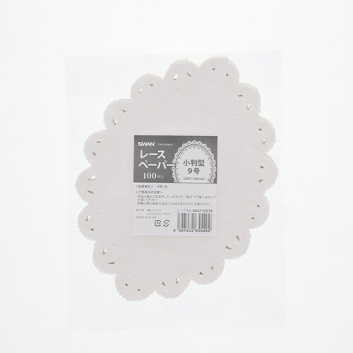紙をレース模様に切り抜いたレースペーパーです。ケーキやお菓子、サンドイッチなどをのせたり、敷き紙として使うと手軽に高級感がアップできます。サイズは220×166mmです。