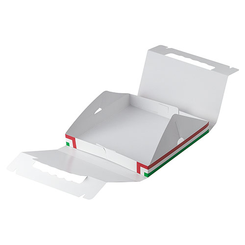 9インチのピザが入る大きさのピザ用ボックス。赤・白・緑を基調としたポップなデザインです。組み立て式の持ち手が付いており、店頭から簡単に持ち帰ることができます。テイクアウトや店頭販売のパッケージにいかがでしょうか。