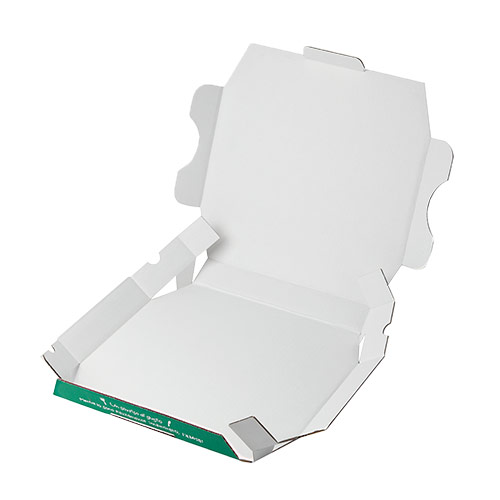 12インチのピザが入る大きさのピザ用ボックス。イタリア語で「美味しい」という意味の「BUONO」という言葉や、ピザのイラストなどがカラー印刷されています。テイクアウトや店頭販売のパッケージにいかがでしょうか。