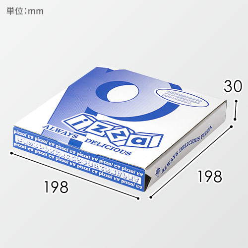 8インチのピザが入る大きさのピザ用ボックス。青色で「Pizza」の文字が印刷されており、目を引くデザインです。テイクアウトや店頭販売のパッケージにいかがでしょうか。