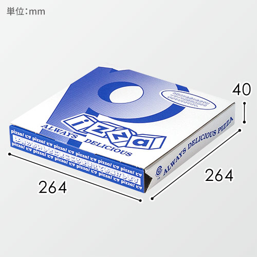 10インチのピザが入る大きさのピザ用ボックス。青色で「Pizza」の文字が印刷されており、目を引くデザインです。テイクアウトや店頭販売のパッケージにいかがでしょうか。