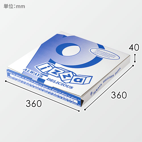 14インチのピザが入る大きさのピザ用ボックス。青色で「Pizza」の文字が印刷されており、目を引くデザインです。テイクアウトや店頭販売のパッケージにいかがでしょうか。