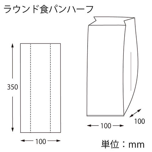 サイドガゼットタイプのベーカリー向けPP袋です。ラウンド食パンのハーフカット用です。食品衛生法規格基準適合商品です。サイズは厚0.025×幅100・全体幅200×高350mmです。