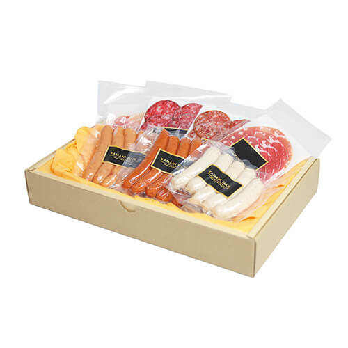 サイズが320×200×50(外寸345×214×54)mmのお肉やハム用ギフトパッケージ。ソーセージ、ベーコン等、高さの低い商品にピッタリ!ハムといった精肉類のパッケージ、ギフト包装にいかがでしょうか。