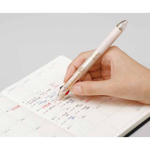 消える3色ボールペン「フリクションボール3」がスリムに!さらに使いやすく携帯性も向し,最大径12.8mmのスリムで軸径で、手帳のペンホルダーに差しやすい段差のないなめらかな形状です。