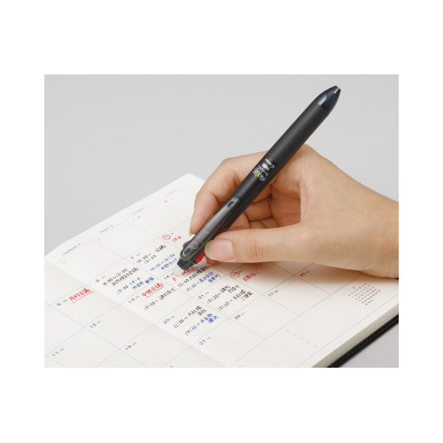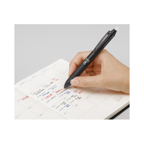 消える3色ボールペン「フリクションボール3」がスリムに!さらに使いやすく携帯性も向し,最大径12.8mmのスリムで軸径で、手帳のペンホルダーに差しやすい段差のないなめらかな形状です。