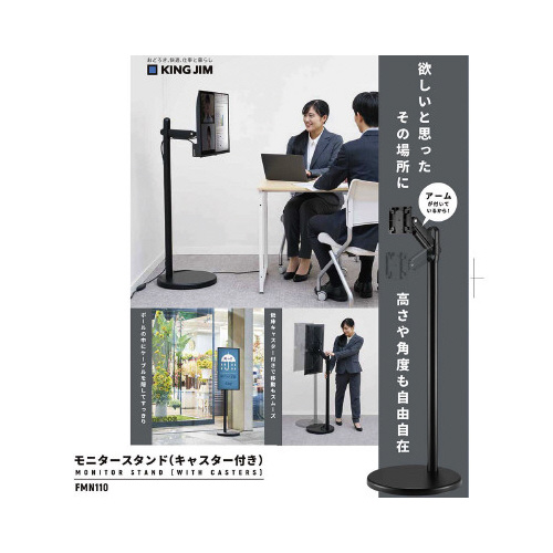 アーム付きで、高さ・角度を自由自在に調整できるモニタースタンドです。モニターの画面をタテ・ヨコ90度に回転可能で、低床キャスターが付いているため、好きな場所へスムーズに安定して移動することができます。