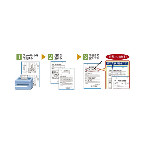 レーザ・コピー機対応のノーカーボン紙です。フォーマットを印刷して、重ねて手書きで記入すると複写されます。書類のサインなども重ねて記入すれば1回でOKです。FSC(R)森林認証紙を使用しています。