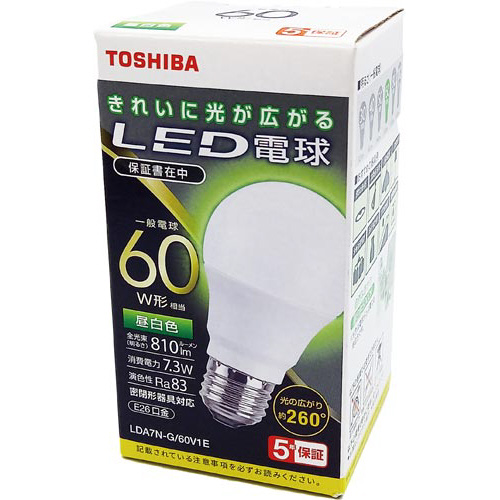 ジャスト電球サイズ。光が広がる配光角260度の全方向60Wタイプ。自然なあかりの昼白色。5年保証(保証書在中)。平均演色評価数Ra83。