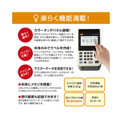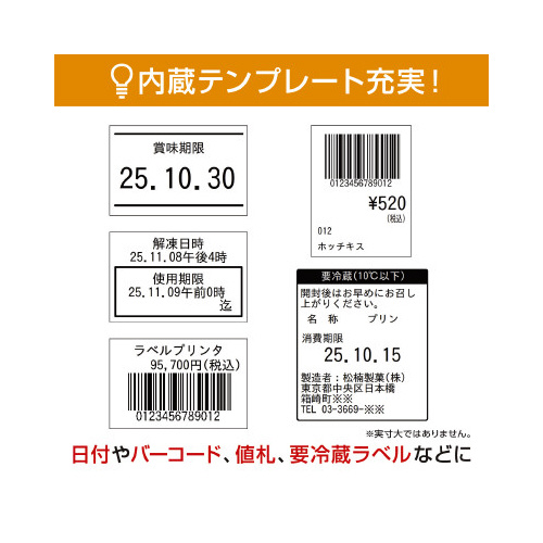 バーコードや日付ラベルを1枚から簡単に発行できるラベルプリンター。パソコン接続なしで本体上で編集/発行もできます。さらにパソコンを使えば既にお持ちのマスタを活用し、ラベル発行することも可能です。