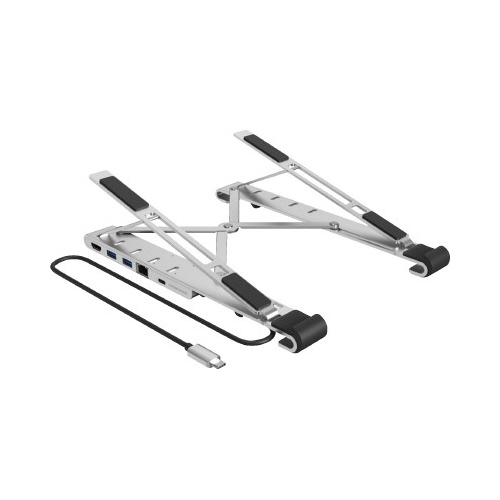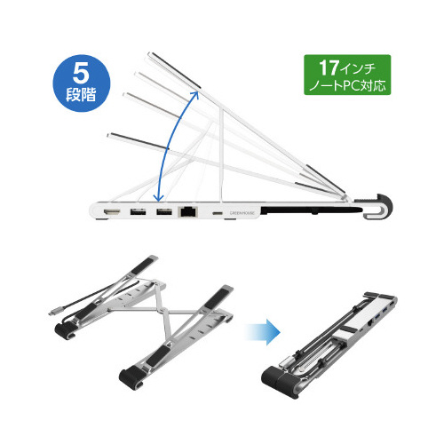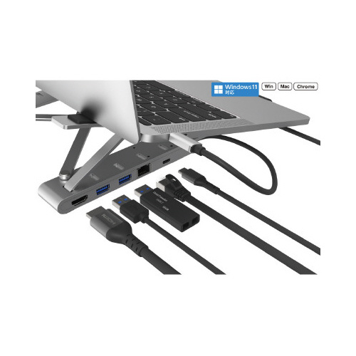 ノートPCスタンド一体型で省スペース、6in1スタンド一体型ドッキングステーション。ノートパソコンを載せて角度調整もできる折りたたみ式アルミスタンド一体型。USB3.2Gen1USBポート搭載。