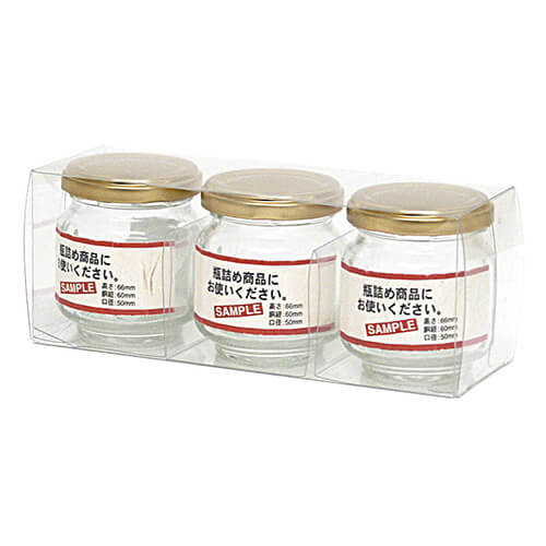 サイズが180×60×70mmの食品類向けギフトパッケージ。広口瓶S×3本にちょうど良い大きさとなっています。さまざまな食品類のパッケージ、ギフト包装にいかがでしょうか。
