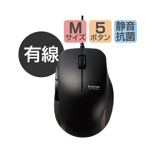 手に心地良くなじむ”手にぴた”設計のため、疲れにくく、握りやすい有線マウス。安心の抗菌仕様。