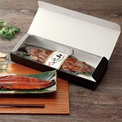 黒絹目格子柄のうなぎ2本用ギフト箱です。エンボス加工で高級感を演出します。