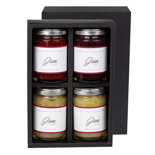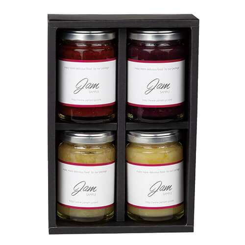 サイズが125×190×57mmの食品類向けギフトパッケージ。広口瓶M箱黒×4本にちょうど良い大きさとなっています。さまざまな食品類のパッケージ、ギフト包装にいかがでしょうか。