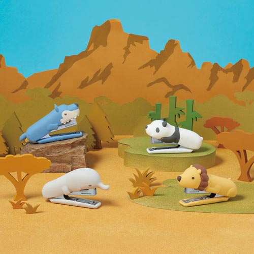 「りくちのいきもの」をテーマにしたシリコンカバーによるかわいらしいホッチキス。机の上にひとつ置きたくなる“いやし系”の仲間たち!