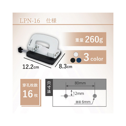 軽い力で穴あけできる2穴パンチです。2つのテコを連動させることにより、パンチ本体のサイズを大きくすることなく軽あけを実現しました。用紙の位置合わせに便利なゲージは耐久性に優れた金属製です。