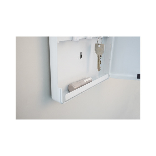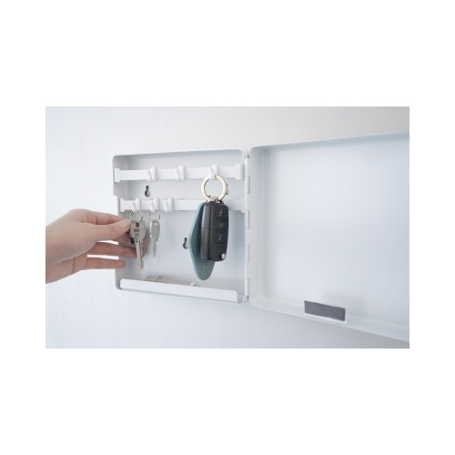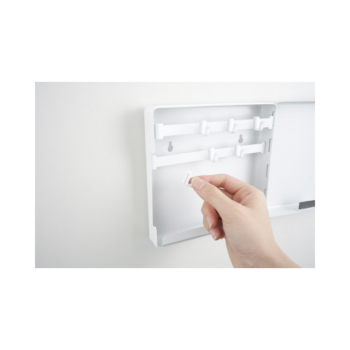 吊り下げ物の大きさに合わせてスライドできるフリーキーフックです。吊り下げ以外にも筆記具や印鑑などを収納できる便利なポケット付きです。開閉扉はマグネットによる脱着式で、収納物が周りから見られません。