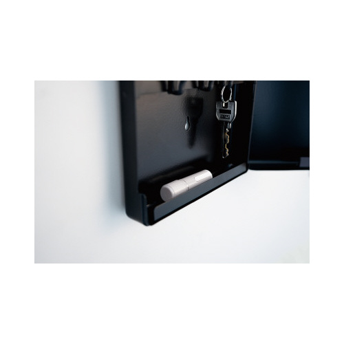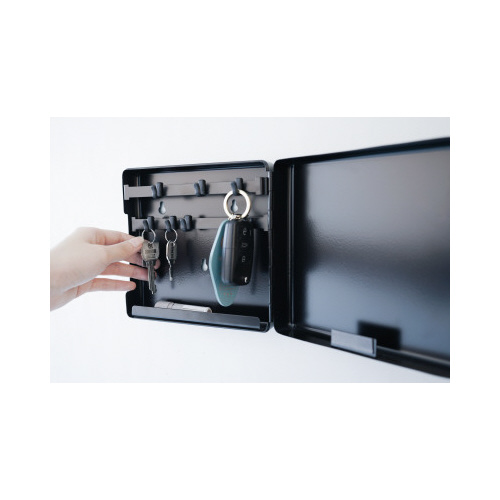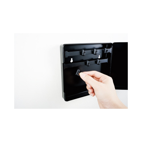 吊り下げ物の大きさに合わせてスライドできるフリーキーフックです。吊り下げ以外にも筆記具や印鑑などを収納できる便利なポケット付きです。開閉扉はマグネットによる脱着式で、収納物が周りから見られません。