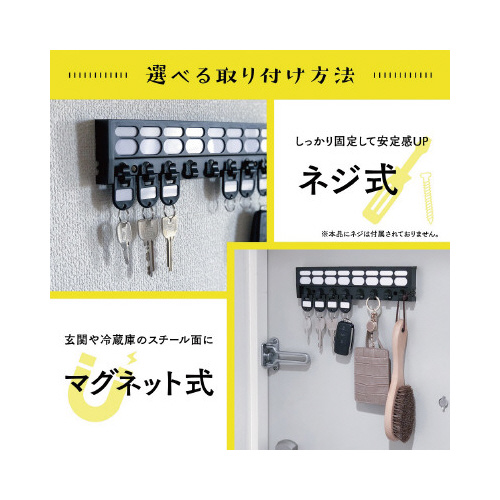 少量の鍵の管理に最適なキーハンガーです。マグネットによるスチール面への取り付けやねじ止めによる壁面への取り付けが可能です(ねじ別売)。名前が書けるネームシート付きで鍵の取り間違えを防止します。