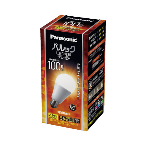 パルックLED電球プレミアタイプ、全方向100形相当。全方向に広がる配光角約260度色鮮やかRa84。断熱材施工器具※1・屋外器具※2対応。