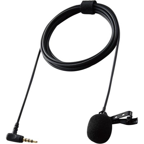 動画撮影に最適な衣服などに装着できるクリップ付きピンマイク。イヤホンを同時に接続できる変換ケーブルや風切り音や息によるノイズを低減できるウインドジャマー、ウインドスクリーン付き。