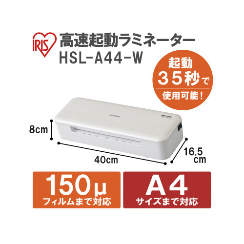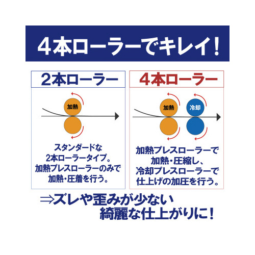 【A4対応】【150μm対応】【4本ローラー】起動後35秒で使用可能!究極のスピードと仕上がりを追求した高速起動ラミネーターです。4本ローラーでズレや歪みの無い綺麗な仕上がりに。