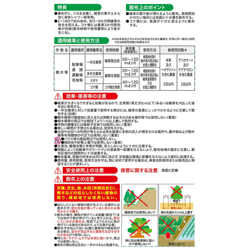 ●雑草の葉や茎にかけてすばやく枯らし、土にまいておくと雑草の発生を予防。