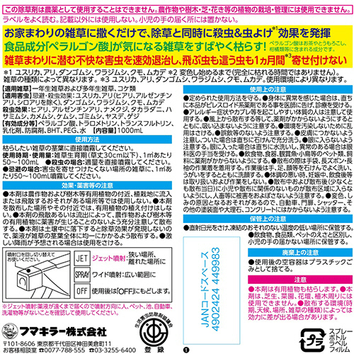 ●殺虫成分が、雑草のまわりに隠れているクモやムカデ、アリ、ダンゴムシなどのはう虫を速効退治してくれます。