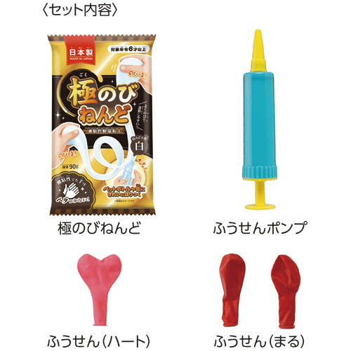 ●セット内容/極のびねんど(90g)1個、ふうせんポンプ1個、ふうせん3個(ハート1個・まる2個)