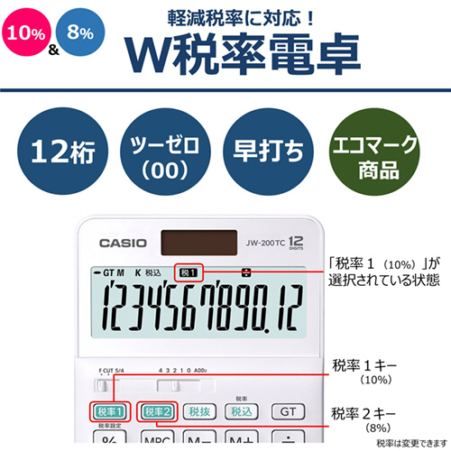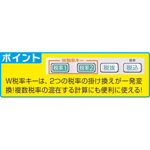 ●機能/早打ち対応、計算状態表示、総合計(GT)、W税計算、マルチ%、四則定数計算、概数計算、桁下げ、切捨て・四捨五入、アドモード計算、00キー、3桁位取り表示、オートパワーオフ