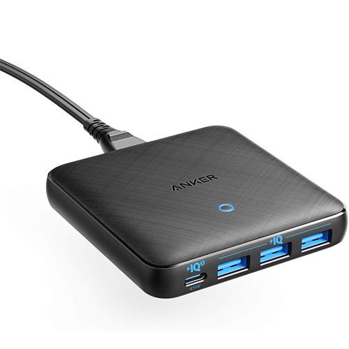●1つのコンセントから同時に4台の機器へ充電が可能。USB-CポートからノートPCへのフルスピード充電に加え、USB-Aポートから最大3つの機器に充電可能です。色はブラックです。