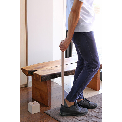 木製キャップがアクセントのデザイン。玄関のオブジェにもなる靴べらで、スタイリッシュな靴べらと収納本体とのセットです。柄が長く靴を履くときに大きく屈まずに使用できます。