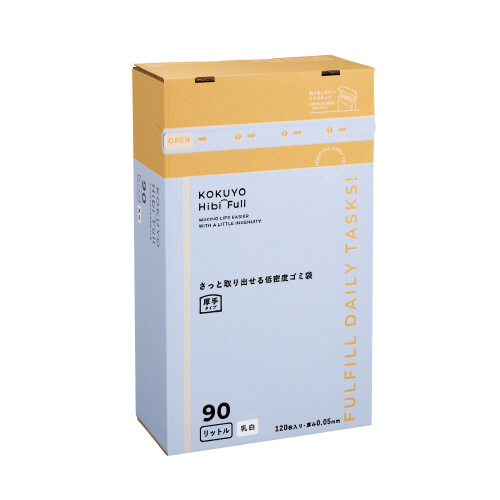 箱の取り出し口が大きなフタ式になっているので、箱ごと置いたままでもさっと取り出しやすくなっている低密度ゴミ袋。0.05mmの厚手タイプなので破れにくい丈夫な仕様。乳白・ツルツルタイプ。