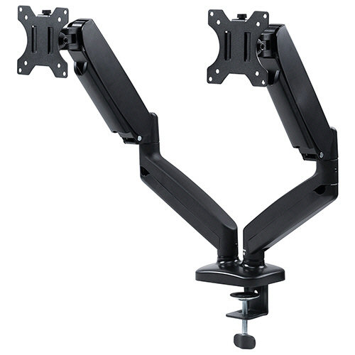 モニターの位置を自由に調整でき、13~32型のモニターに対応するガススプリング式のデュアルモニターアーム。