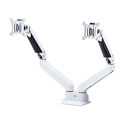 ●机上面を有効活用。クランプ&グロメット式2面モニターアーム。本体色はホワイトです。