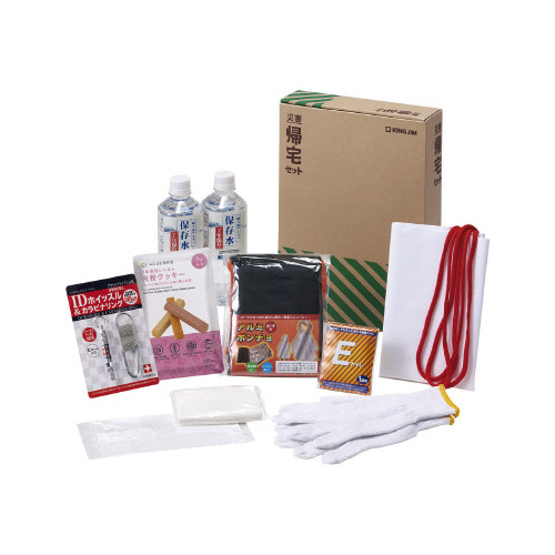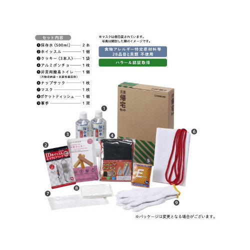 ●セット内容/保存水(500ml)×2本、ホイッスル×1個、クッキー(3本入)×1袋、アルミポンチョ×1枚、非常用簡易トイレ(汚物収納袋十抗菌性凝固剤)×1個、ナップサック×1枚、マスク×1枚、ポケットティッシュ×1個、軍手×1双