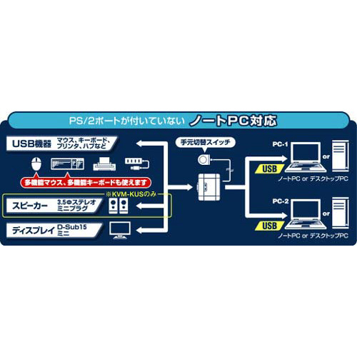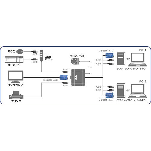 一組のディスプレイ・キーボード・マウスで2台のパソコンを切り替えて使えます。手元のスイッチで簡単に切り替えできて便利なタイプ。USB機器の共有もできます。